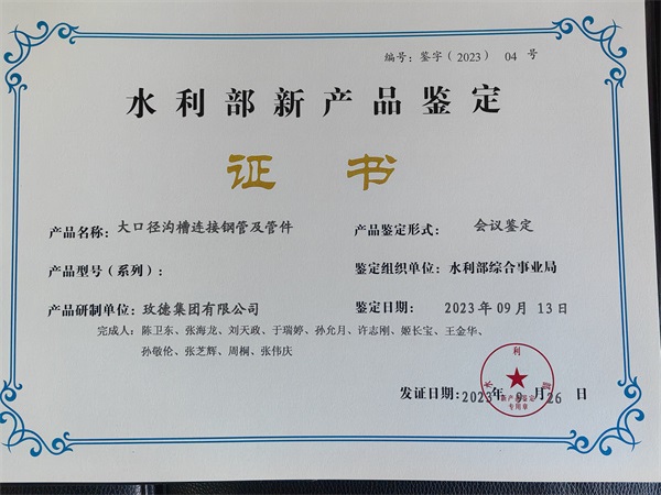 11.9月13日,玫德集團有限公司自主研制的“大口徑溝槽鋼管及管件”,通過水利部及行業專家鑒定,產品加工技術及能力達到國際領先水平,產品達到國際先進水平,開創了大口徑埋地鋼管溝槽連接的先河。