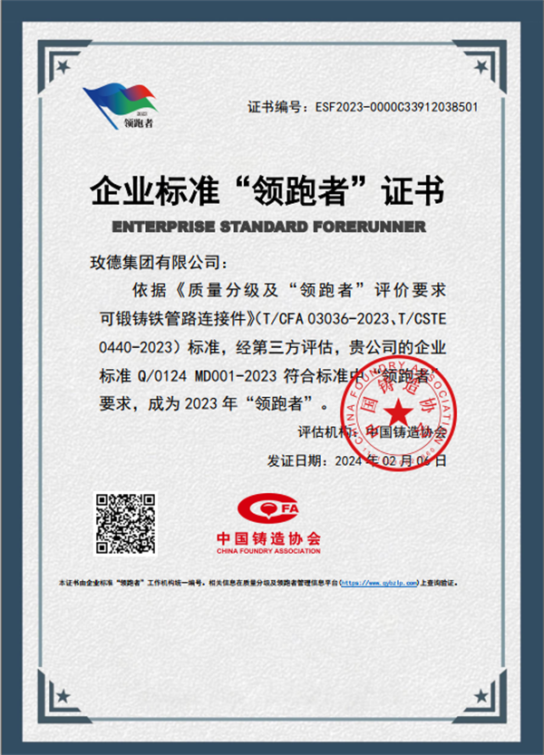 玫德集團(tuán)有限公司入選“領(lǐng)跑者”的 Q/0124 MD -2023《可鍛鑄鐵管路連接件》企業(yè)標(biāo)準(zhǔn),整體技術(shù)水平高于國際標(biāo)準(zhǔn)和國家標(biāo)準(zhǔn),達(dá)到國際先進(jìn)水平。高水平標(biāo)準(zhǔn)引領(lǐng),為行業(yè)高質(zhì)量發(fā)展提供了切入點,強(qiáng)化了標(biāo)準(zhǔn)引領(lǐng)作用,促進(jìn)了行業(yè)全面質(zhì)量提升。