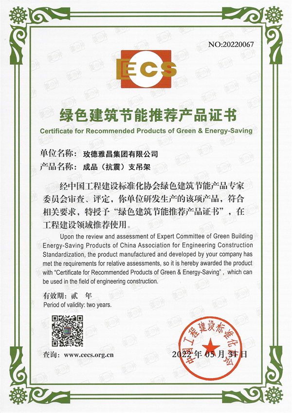 玫德雅昌支吊架產品擁有齊全的檢測報告及國際權威認證,主編及參編多項支吊架相關的國家和行業標準,產品獲得中國建筑標準設計研究院頒發的高品質認證、綠色建筑節能推薦產品證書,并通過FM/UL國際認證。