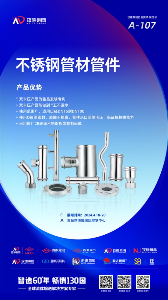 2024年4月18日-20日,玫德集團作為白金贊助商攜手中國水協在青島召開中國城鎮供水排水協會2024年會暨城鎮水務技術與產品交流展示會。屆時玫德集團會展出大口徑溝槽式鋼管及管件、科大晨暉智能儀表、水務領域智能閥門、不銹鋼管材管件、智慧水務整體解決方案等軟硬兼具的一站式產品及解決方案。