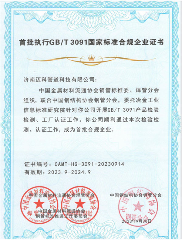 濟南邁科管道科技有限公司作為首批執行GB/T3091國家標準合規企業之一,近年來積極參與標委會各項國家和行業標準的制修訂工作,愿為鋼管行業的持續健康有序發展貢獻玫德力量!