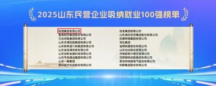 8月19日,2025山東民營(yíng)企業(yè)百?gòu)?qiáng)系列榜單發(fā)布會(huì)盛大舉行,玫德集團(tuán)入選2025山東民營(yíng)企業(yè)200強(qiáng)、2025山東民營(yíng)企業(yè)吸納就業(yè)100強(qiáng)。